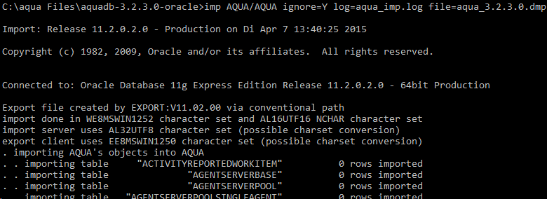 Mit Ihrem Installationspakt haben Sie einen Ordner mit mehreren SQL-Skripten und einem Datenbankdump erhalten. Mit diesen Dateien können Sie eine initiale Datenbank für Ihr aqua aufsetzen. Zum Aufsetzen der Datenbank benötigen Sie die Werkzeuge sqlplus, sqlldr und imp. Zusätzlich benötigen Sie die Zugangsdaten eines Accounts mit Administrationsrechten für die Oracle-Datenbank. Wir nehmen für den Rest der Anleitung an, dass Sie den 'system' Account verwenden. Die Datenbank, mit der sich die Werkzeuge verbinden, wird mit der folgenden Notation angegeben: