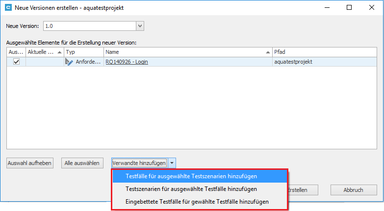 Als Vereinfachung bietet aqua die Möglichkeit an, die neue Version eines Testfalls in einem Testszenario einzubinden, indem man auf den Verwandte hinzufügen Button klickt.