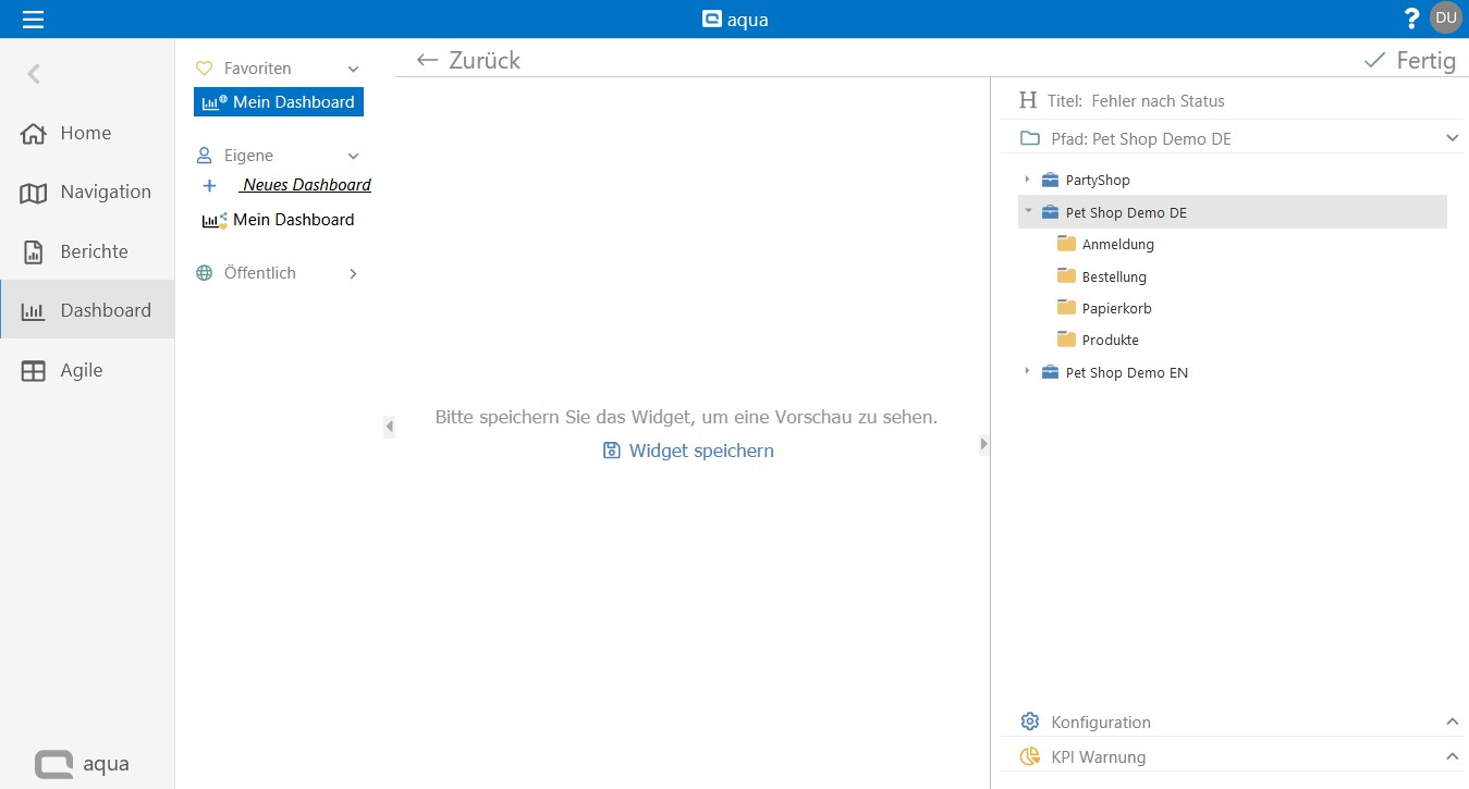 Zum Hinzufügen eines Widgets, klicken Sie auf Widget hinzufügen in der Mitte des Bildschirms, wenn es sich um ein neues Dashboard handelt, oder auf den Button oben rechts. Geben Sie dem Widget einen Titel und wählen Sie ein Projekt oder einen Unterordner, dessen Daten gezeigt werden sollen.