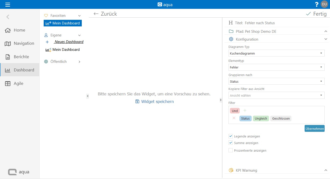 Klicken Sie auf Konfiguration, um das Widget zu konfigurieren. Wählen Sie einen Diagramm Typ und einen Element Typ. Definieren Sie die Gruppierung und wählen Sie einen Filter, wenn benötigt.
