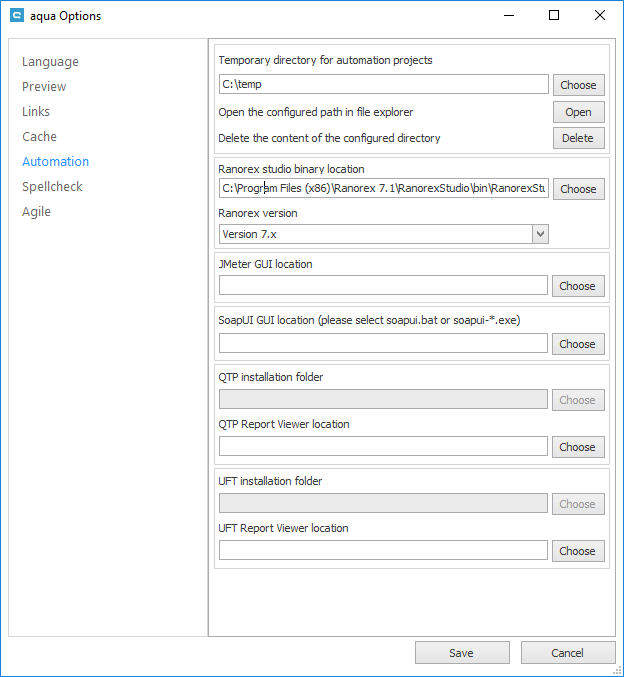 To automate tests with different tools you may need a third party tool. The location of these third party tools and a temporary directory for automation needs to be given to aqua. To do so, click File -> Options.