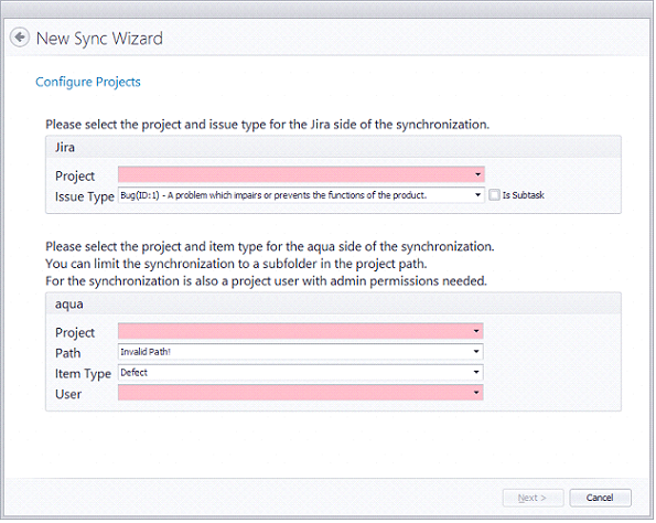Similar to the process of choosing a project from Jira, the Sync Wizard needs to know which aqua Project should be synchronized. The field Path represents the project hierarchy established in aqua to find our project path more easily. Item Type shows the supported aqua types. In this example, we choose Defect.