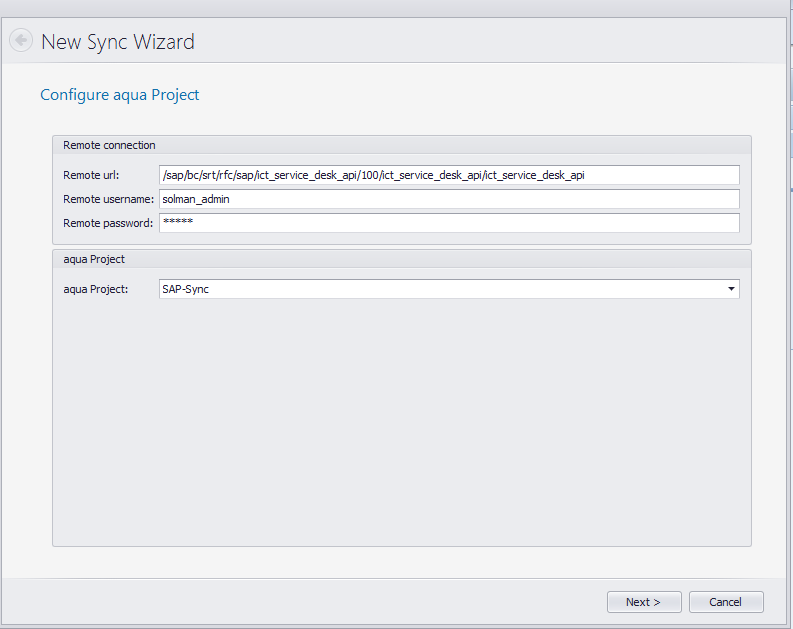 Select the aqua project created in step 4, then click 'Next'. The sync wizard will create a partial sync config.
