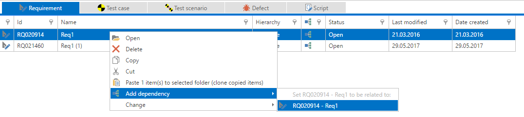 You can also create a dependency out of an element. To do so, open an item and click on 'Dependencies' on the navigation bar and chose an item-type from the 'Set dependency' section.