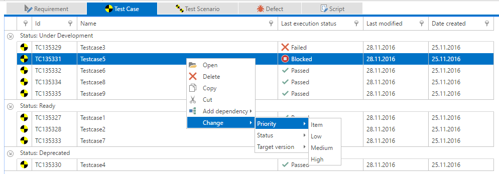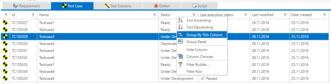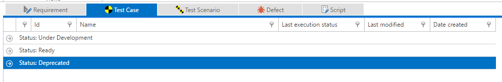In this scenario, we have 9 test cases, each with a different workflow status and Last execution status.