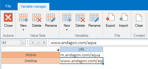 You can parameterize your Ranorex test cases by using aqua parameters. To do so, open the Variable Manager and insert some variables.