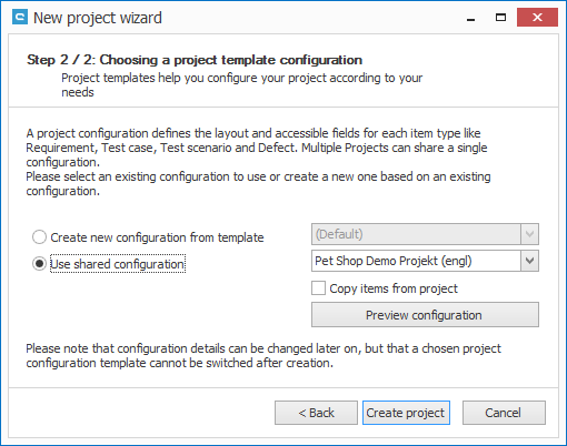 A project configuration can be shared. That means that projects always have the same configuration as the master project. All configurations have to be made in the master project and cannot be changed later in the linked project. Therefore choose the option Use shared configuration in the project wizard and select a master project. This is described in the following screen.