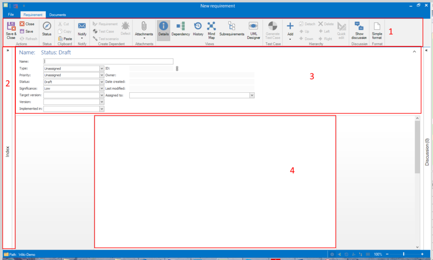 The ribbon bar in the requirements section shows some additional and for this section specific new buttons. The following table explains the functionality of each button: