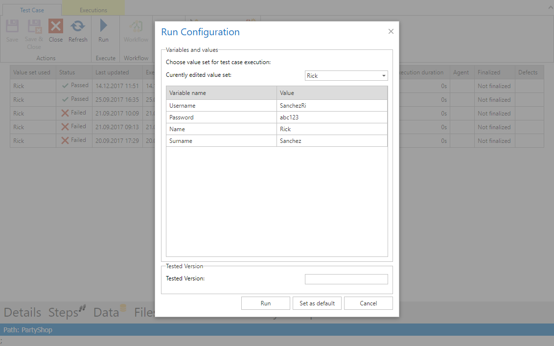 Clicking Run opens a configuration window where you can enter the tested version and choose the value set. The value set is described in section Variable Manager. Start the execution by clicking Run.