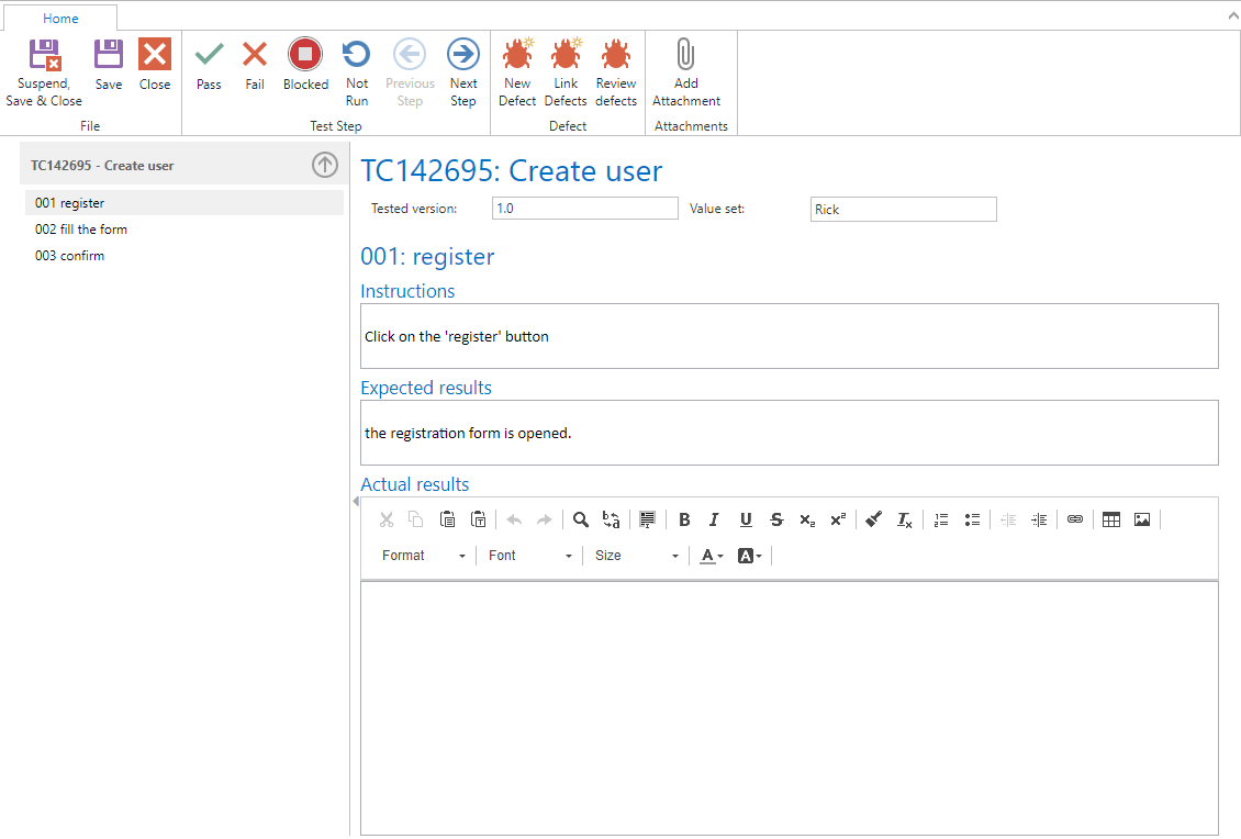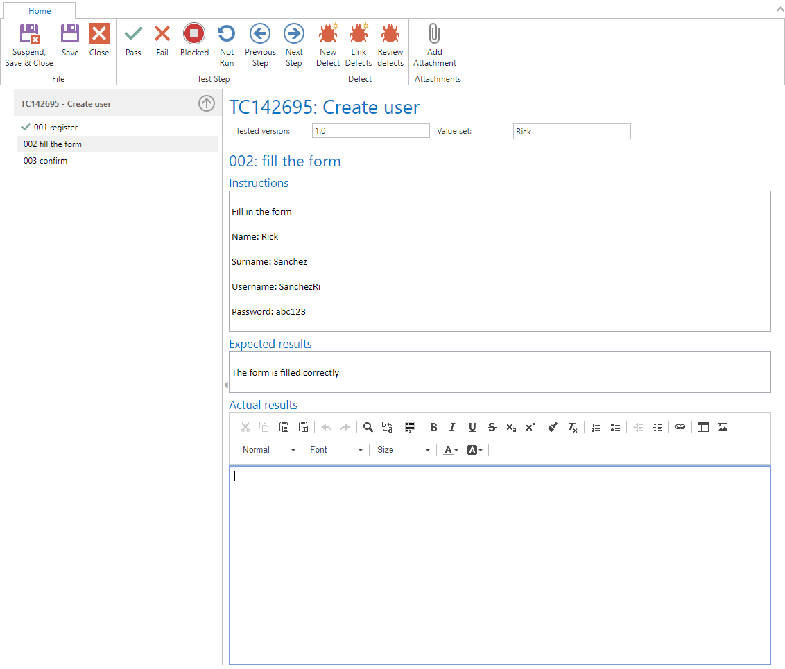 The second step is a test step. Here we find an Instruction and an Expected result as well as the Actual results field.