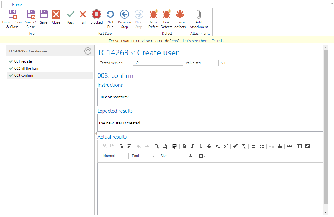 A new tab provides step-by-step the tasks to be performed in the given test case. The screenshot below shows a conditional step. Document the current behavior in Actual results. You can also instantly review related defects during execution.