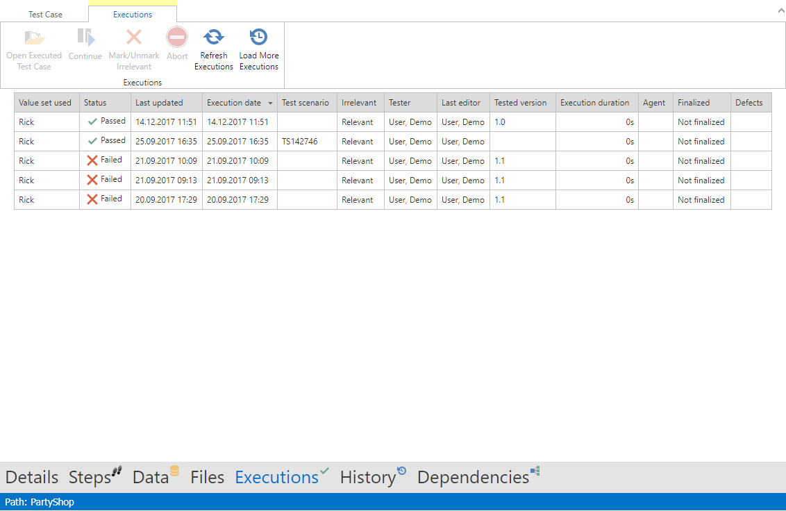 Clicking the Continue button can continue an executed test case if it is not finalized. Test results can be specified again. Furthermore, an execution can be marked as Irrelevant.