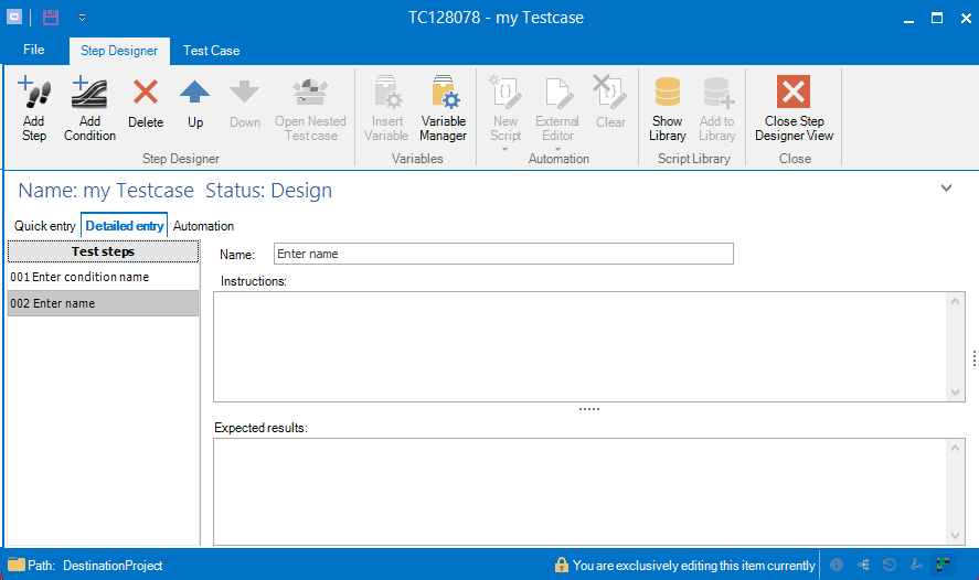 The step designer allows to create steps and conditions to create manual test steps and to extend it with automated tests.