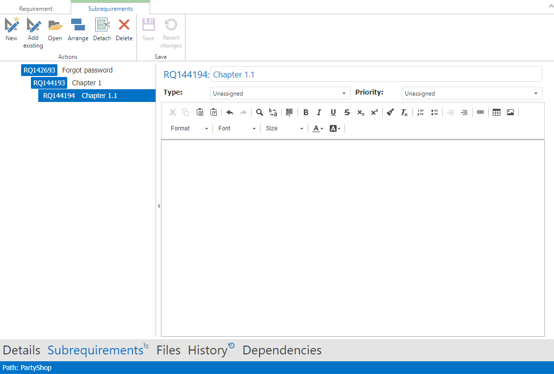 In sub requirements, a full product specification sheet of a software can be specified in chapters and sub chapters. These allow you to divide your chapters into standalone requirements. They can be assigned to different users and have different status, test cases and defects. So you will be able to monitor your process. In the end, you can merge everything together in one document, which can include all executed test cases, closed and known defects, and calculated parameters.