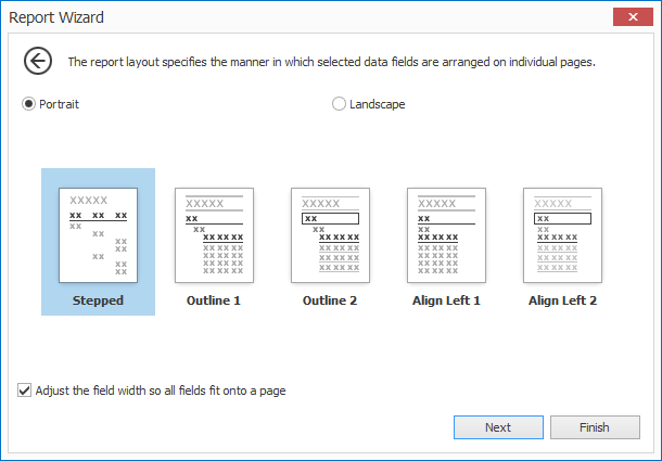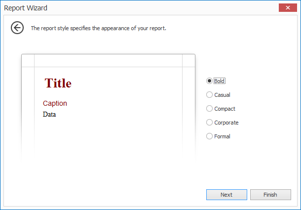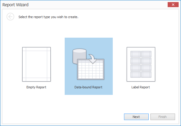 Creating an Empty Report will close the report wizard again. Creating a Data-bound Report will add some basic grouping and bands to your report. Creating a Label Report will add a panel in which all labels will have the same style.