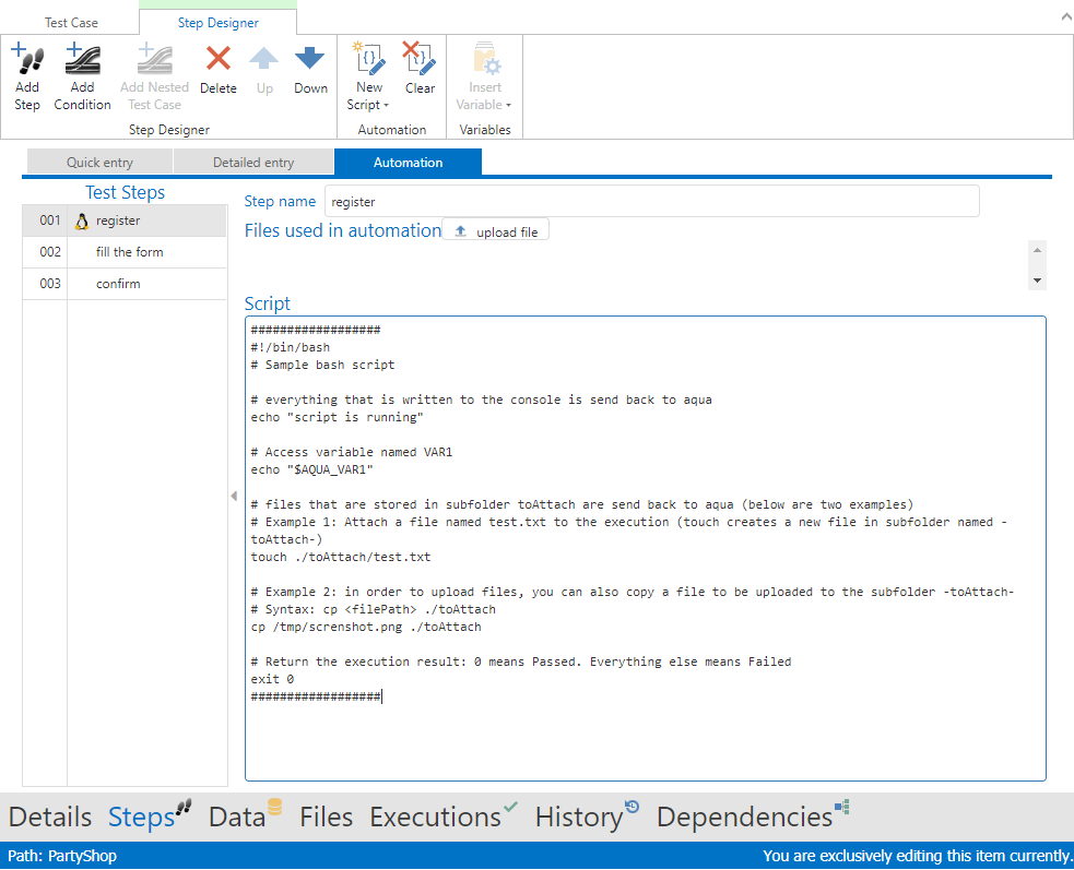 In order to run a UnixShell-Script in aqua, create a new test case, open Step Designer and select tab Automation. Select the test step (click the empty space of the given step) and add a new UnixShell-Script.