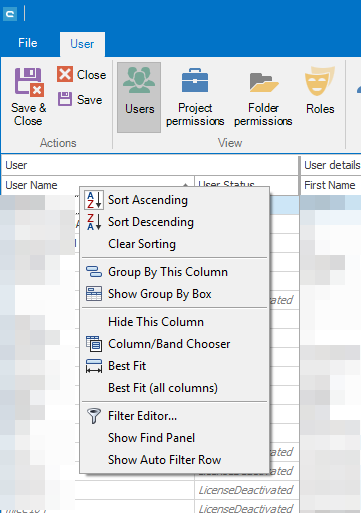For adding a new user press button "Add" from the Ribbon Bar on top of the window. A user dialog will allow you to enter user details, assign the corresponding license and add the user to a project. In order to use the
