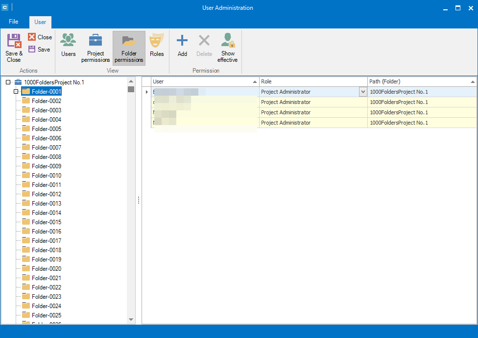 The screen User Administration opens. Here you can manage your projects and users with different roles and rights in a matrix. You can add new users with a wizard, assign licenses, manage new roles under Roles and see the permissions in sub folders. Furthermore you can get a good overview of which project every user is working on.