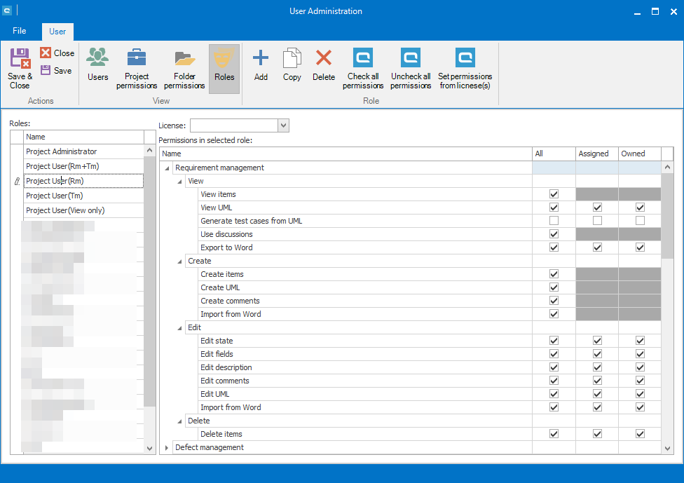 In the user administration you can define individual roles, which customize the rights of your user groups. Later on, the role can be assigned to a specific user in a specific project in View "Project permissions". Here you will find the predefined roles Project Administrator, Project User (Rm+Tm), Project User (Rm), Project User(Tm), Project User(View only) and Project Assignment. The roles Project Administrator and Project Assignment cannot be changed due to internal processes and the connection to external tools.