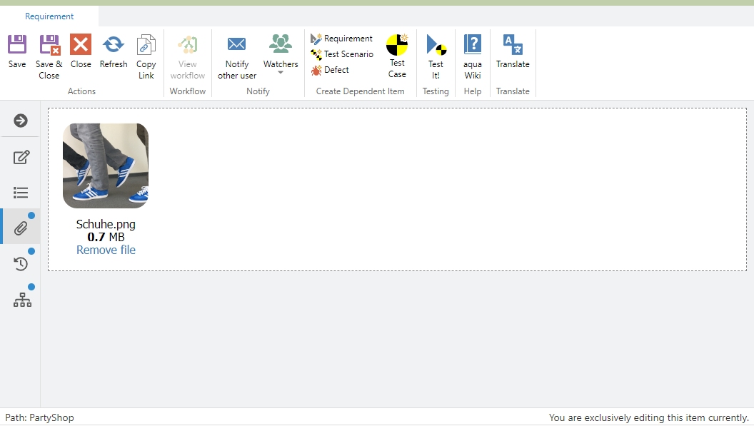 You can add attachments to items or executions in aqua Web. To do so, open an item and click Files. Here you can simply drop your files, or click on the grey bar in order to browse for a file. There will be a paperclip icon visible if your item has any attachments.