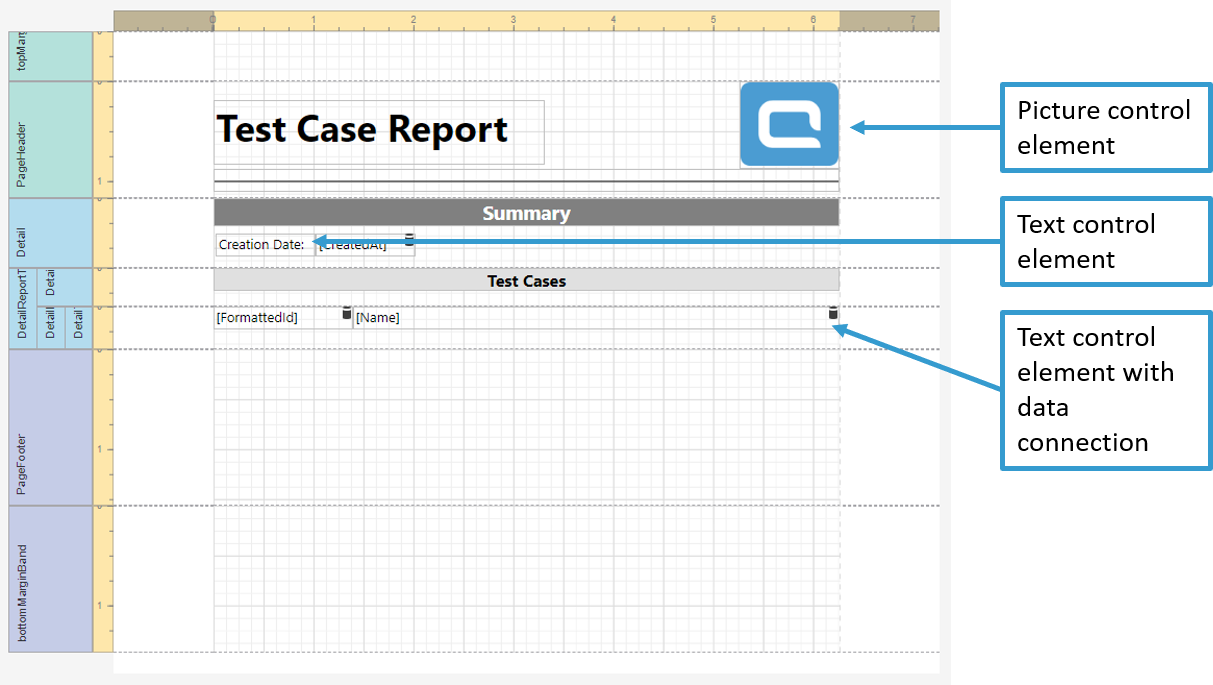 These elements can be bound to a certain tree element value of the report. For example, if I bind a label to the name value from the test case report, then the text value of this label is set to the name of the currently processed test case for each band iteration.