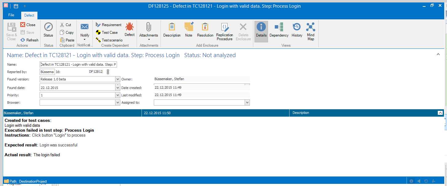 The name is defined by default using the test case ID, test case name, and the test case step. “Found by”, “Found in”, and “Found at” is adopted by the test case. In the description, the defect is defined by default by the main facts of the test step. After saving the defect, you can analyze in dependencies how to reproduce the defect and which test cases have to be executed in order to specify that the functionality is fixed.