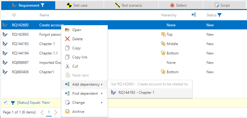 You can also create a dependency out of an element. To do so, open an item and click on 'Dependencies' on the navigation bar and chose an item-type from the 'Set dependency' section.
