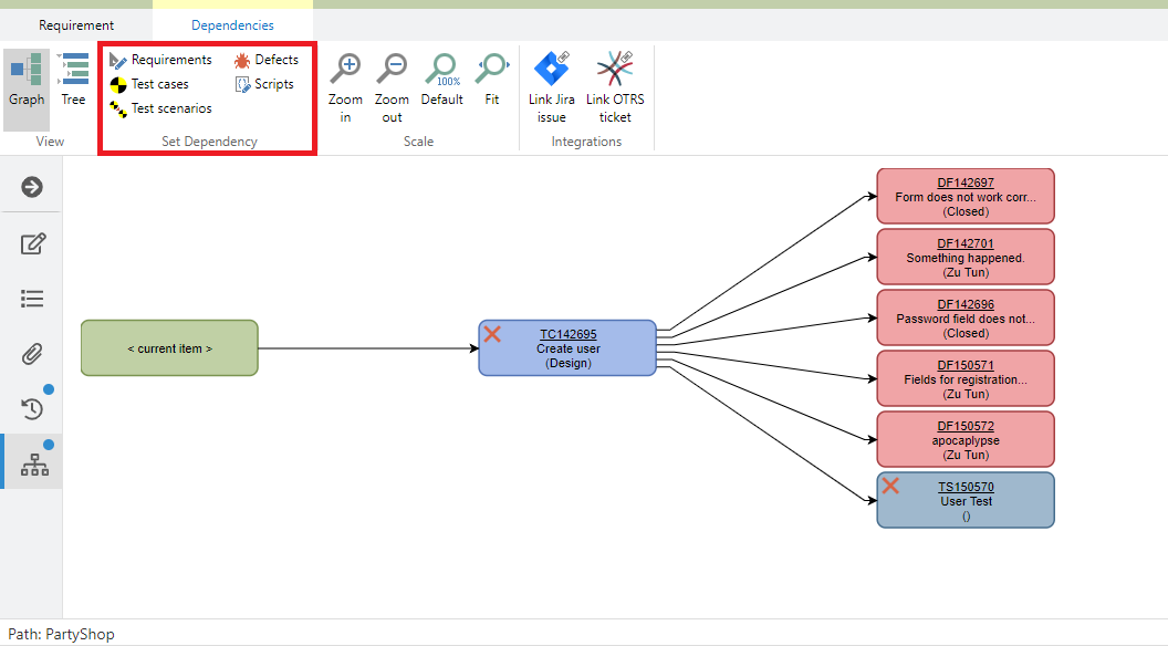 You can also create new dependent items from existing items. To do so, open an item and select an item type from the 'Create Dependent Item' section in the ribbon. A new tab with a new item will open and a dependency is added.