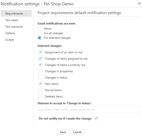 All notifications can be set separately for each item type. Select the item type, you want to define notifications for from the list on the right.