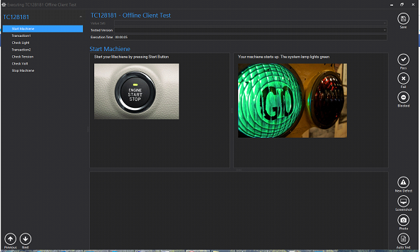 Here, you can pass, fail, and block your test steps which can be found on the left-hand side. The left upper fields show the instructions, and the right upper field the expected result. Down in the centre, you can insert the actual result. On the right-hand side you can
