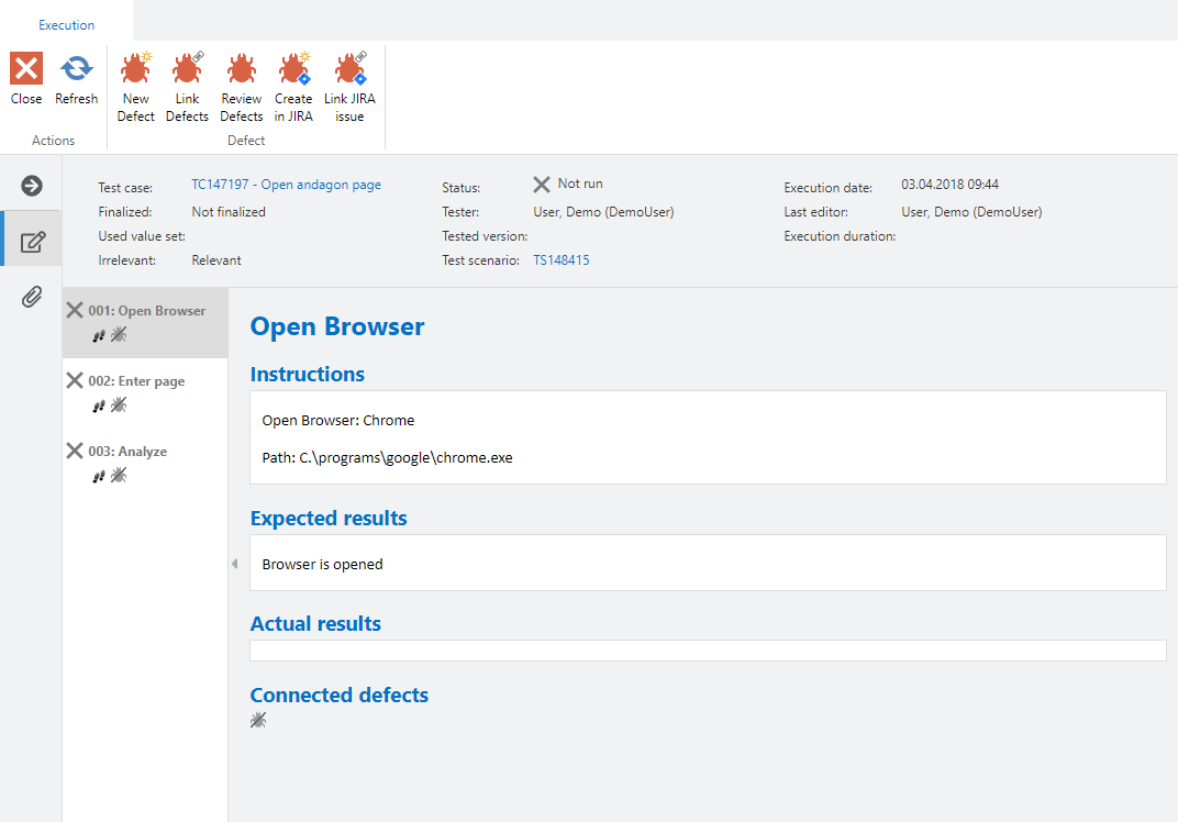 You can execute either a selection of test cases in your scenario, or the entire scenario. To execute the full scenario click 'Run all'. The execution window opens and you can execute each test case step by step.