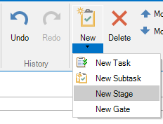 In order to add a stage, you open an existing project plan and press the button. You can now add a new stage by clicking on the arrow below the button and select 'New Stage'