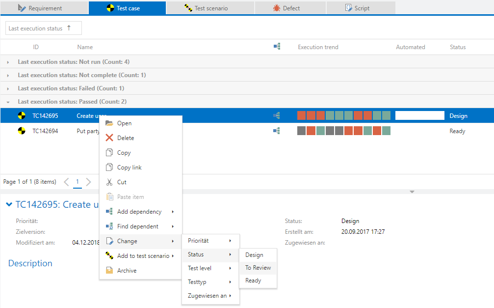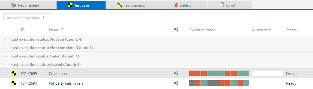 In this scenario, we have 9 test cases, each with a different workflow status and Last execution status.