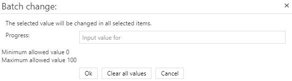 These fields can be changed without opening them. When the number of values for a changeable field exceeds 20, you have the possibility to search for the value you need. To do so, click the field's name you want to change. A window will open, where you can look for the target value, or directly type it in (depending on the field type).