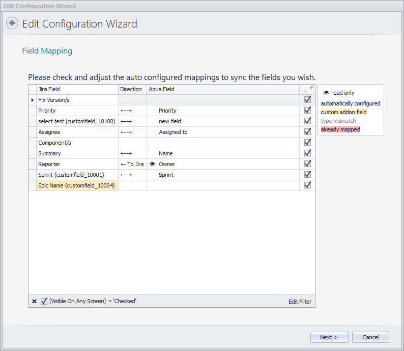 The legend box on the right-hand side informs the user which fields were automatically set by Jira. This happens when there are specific field types (i.e. fields with numerical value). If the same aqua field is taken in a different Jira field, both cells will be marked red with an error message at the bottom. Fields with similar names will be mapped automatically.