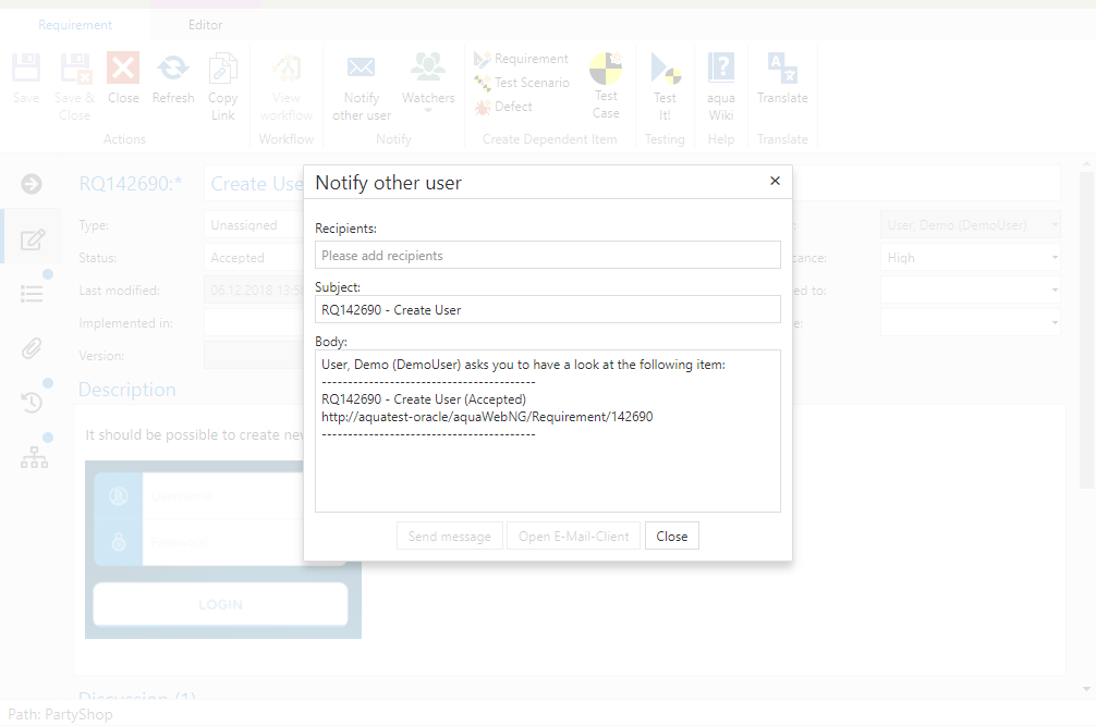 You can also choose colleagues that should be informed once on a specific item, i.e. to send them this item to have a look at it. To do so, open this item in aqua Web.
