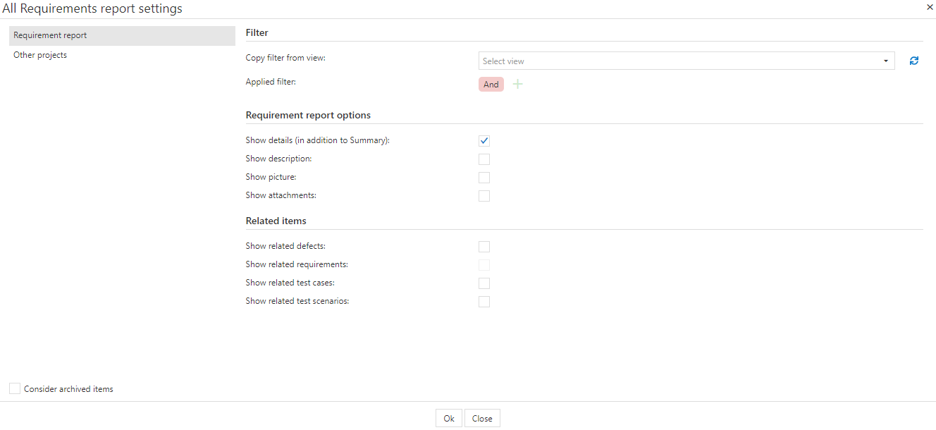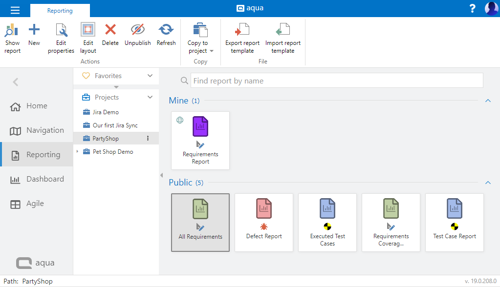 The reporting module of aqua Web can be used to display information about requirements, test cases, test scenarios or defects and their related items respectively. To show a report switch to 'Reporting' on the navigation bar. Report templates can be used in multiple projects, either by directly copying them to another project or by storing the report locally and then importing the report into a new project using the Import / Export function.