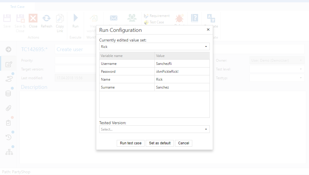 Clicking Run opens a configuration window where you can enter the tested version and choose the value set. The value set is described in section Variable Manager. Start the execution by clicking Run.