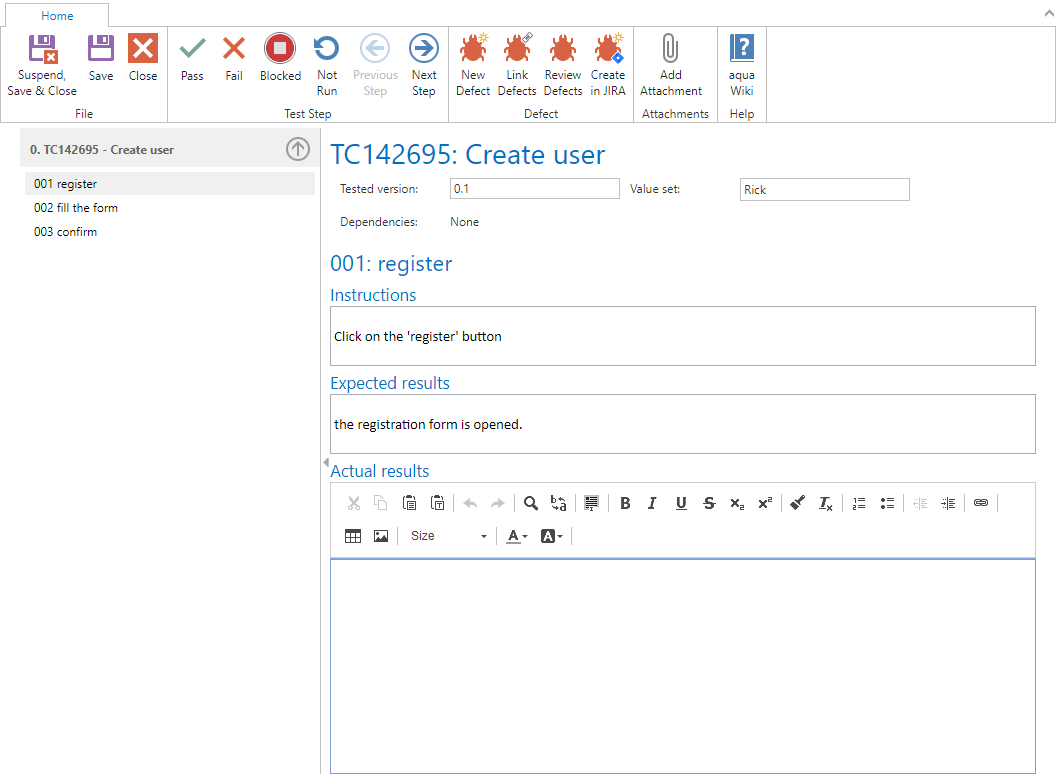 The second step is a test step. Here we find an Instruction and an Expected result as well as the Actual results field.