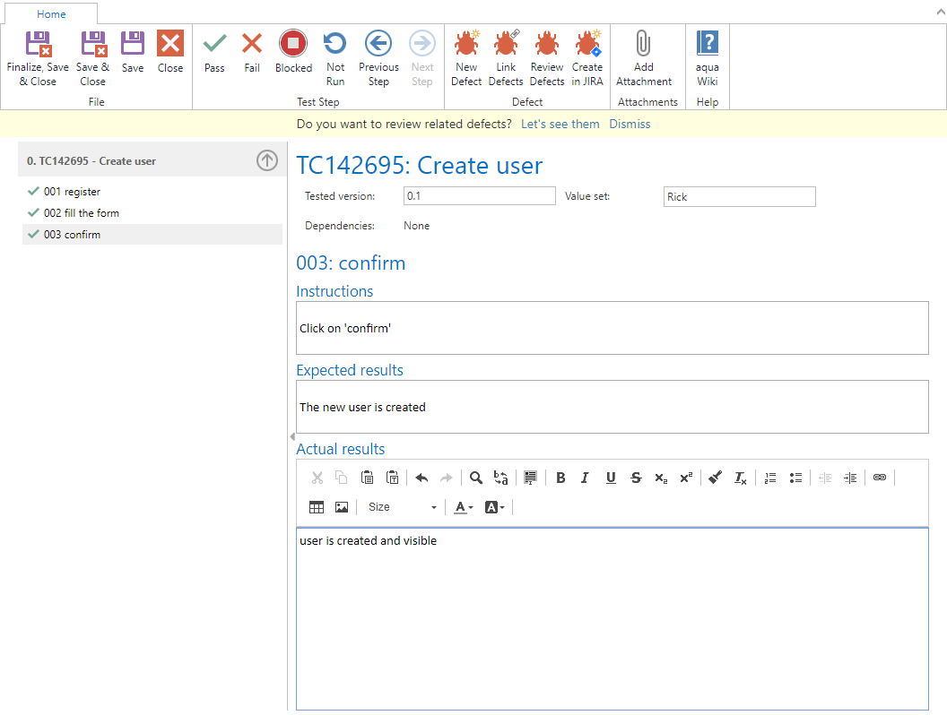 A new tab provides step-by-step the tasks to be performed in the given test case. The screenshot below shows a conditional step. Document the current behavior in Actual results. You can also instantly review related defects during execution.