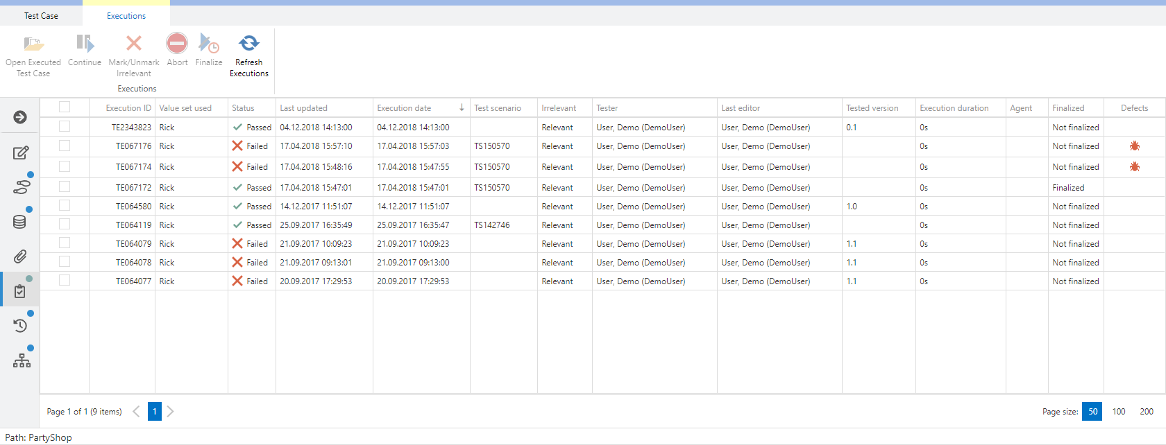 Clicking the Continue button can continue an executed test case if it is not finalized. Test results can be specified again. Furthermore, an execution can be marked as Irrelevant. Thus, it will not be counted as execution, e.g in reporting.