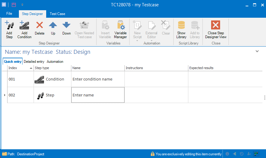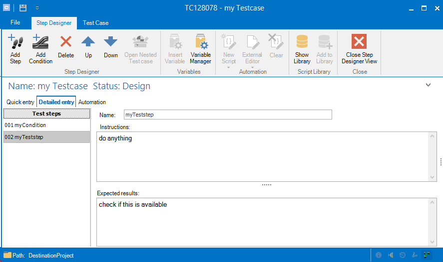 The step designer allows to create steps and conditions to create manual test steps and to extend it with automated tests.