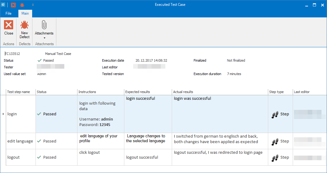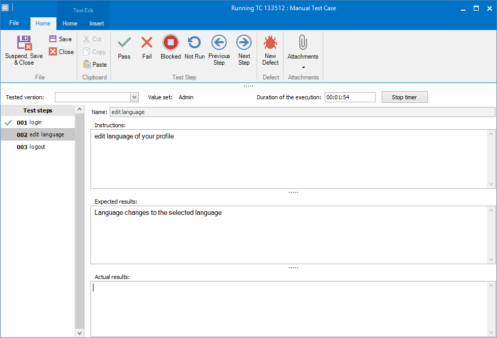 The second step is a test step. Here we find an Instruction and an Expected results. Moreover we find an extra field Actual results, where we can document the result we receive while executing. We are documenting the result as the following: