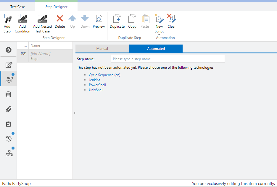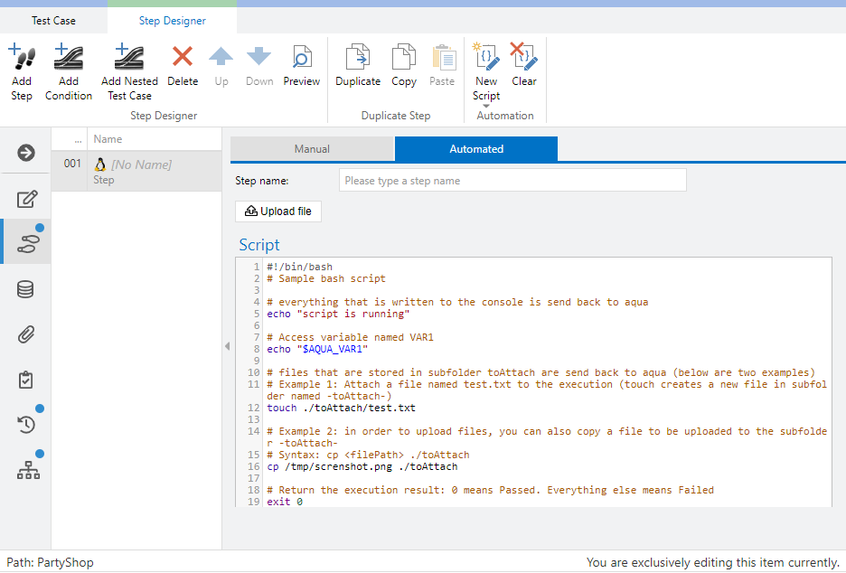 In order to run a UnixShell-Script in aqua, create a new test case, open Step Designer and select tab Automation. Select the test step (click the empty space of the given step) and add a new UnixShell-Script.