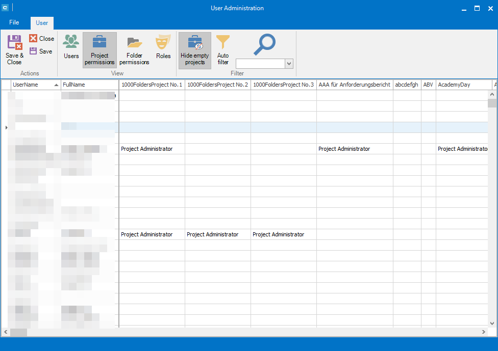 The screen User Administration opens. Here you can manage your projects and users with different roles and rights in a matrix. You can add new users with a wizard, assign licenses, manage new roles under Roles and see the permissions in sub folders. Furthermore you can get a good overview of which project every user is working on.