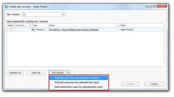 As a simplification, aqua offers the option to include the new version of test cases of a test scenario by choosing the Add related button.