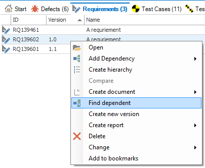 The dependencies of the individual elements can also be viewed within the context menu or the dependencies button. It displays which element is the newer, the older, or an alternative version.