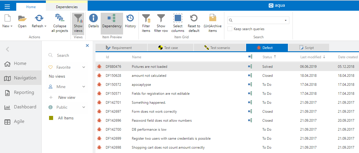 Within navigation, it is possible to create different sorting and groups. These can be saved in views in order to switch between them. Views can be marked as favorites to find them quickly. Besides that, they can be public, or individual. To see existing views, click . A side bar will appear, where you see all existing views, grouped by favorite, mine and public.