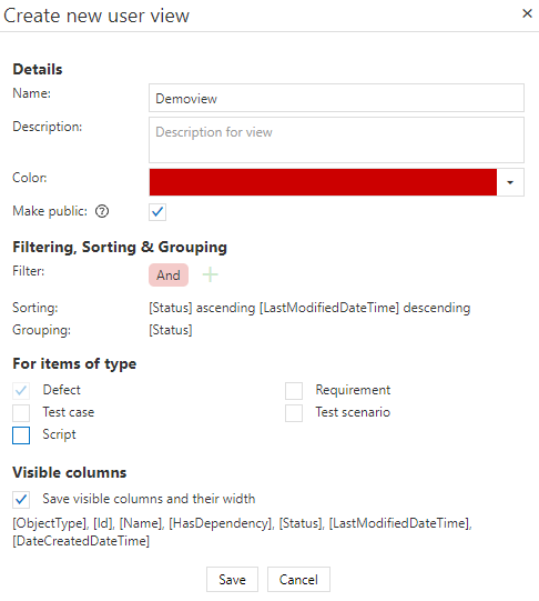As soon as the view looks as expected, click 'New view' under 'My views'. A window will open where you can define the view, e.g. if it should be public or not. Public allows other users in the given project to see and apply your view accordingly. Furthermore you can decide for which item types the view should be applicable.