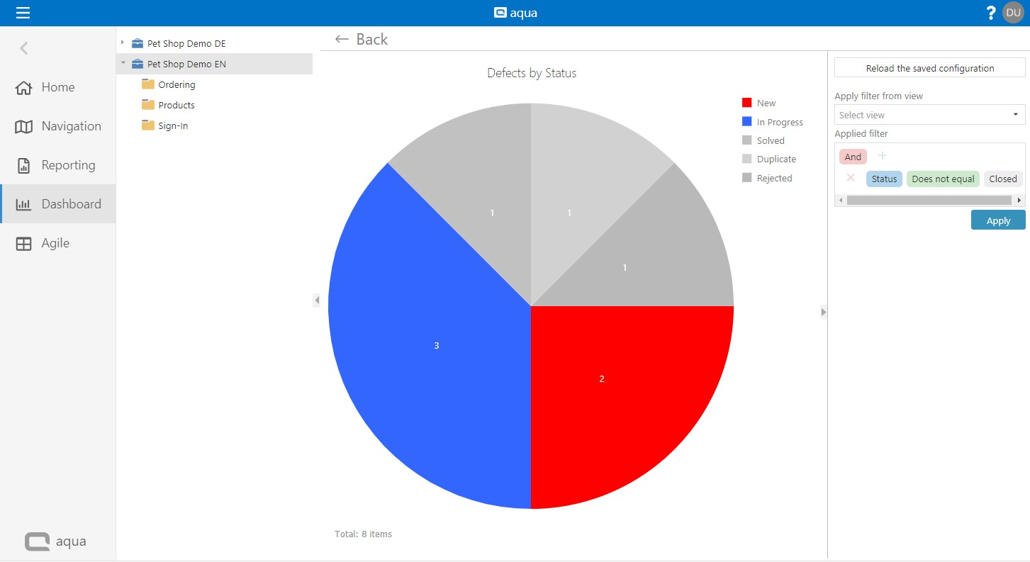 For a deeper analysis of a single chart, maximize it. You can do this either by clicking the maximize button or simply by clicking inside the widget. Now you will see your aqua project tree on the left side and a filter selection on the right side. This way you can easily apply the widget to other projects or subfolders or further narrow the widget's data using filters or views. This has no effect on the configuration of the widget itself and can be reset by clicking on Reload the saved configuration or when returning to the dashboard.